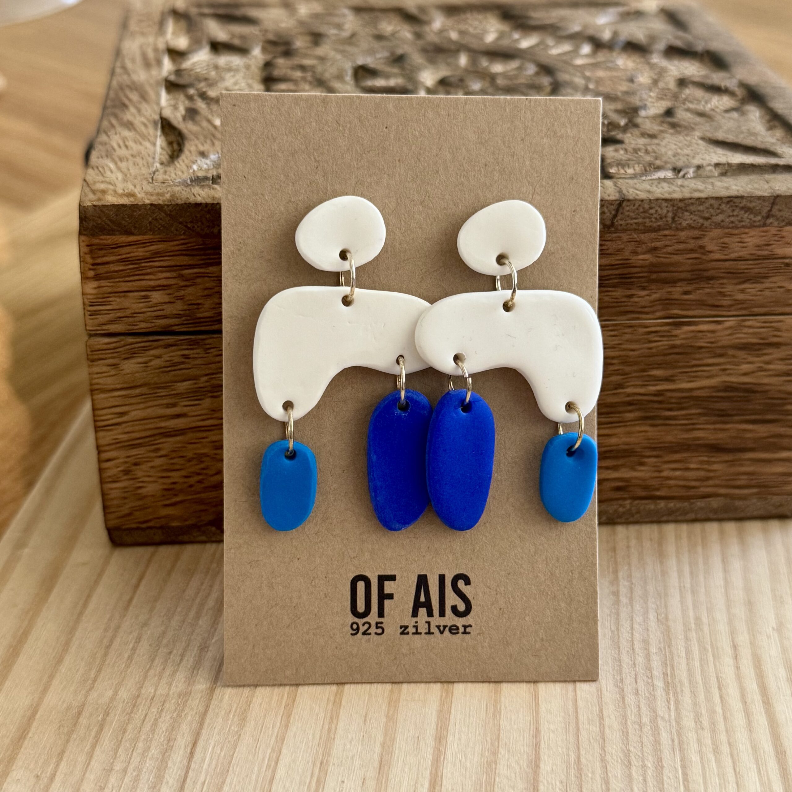 De oorbellen zijn zo’n 50 x 30 mm groot. De kleurrijke tussenstukken zijn asymmetrisch afgewerkt en hebben de volgende kleuren: wit, donkerblauw en helderblauw.